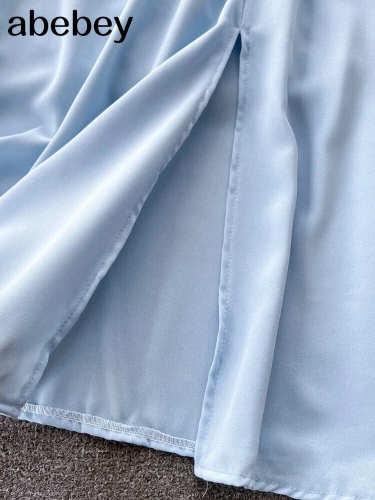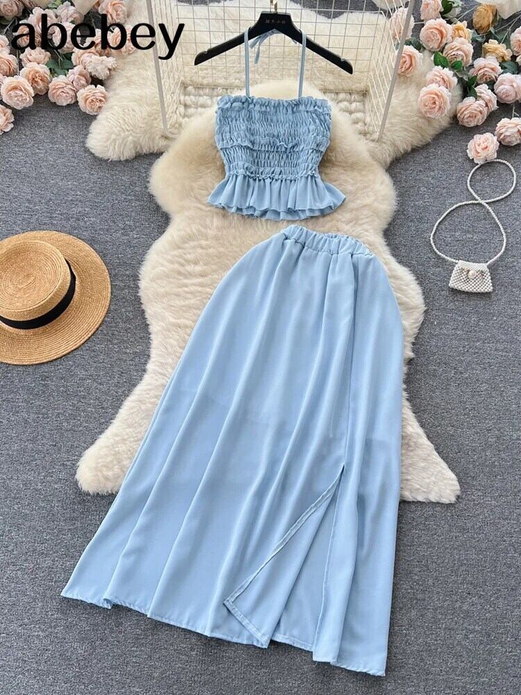 プリーツ薄手ビキニカバーアップセットキャミソールクロップトップとソリッドスプリットロングスカートツーピース水着ビーチドレス ソリッドカラー