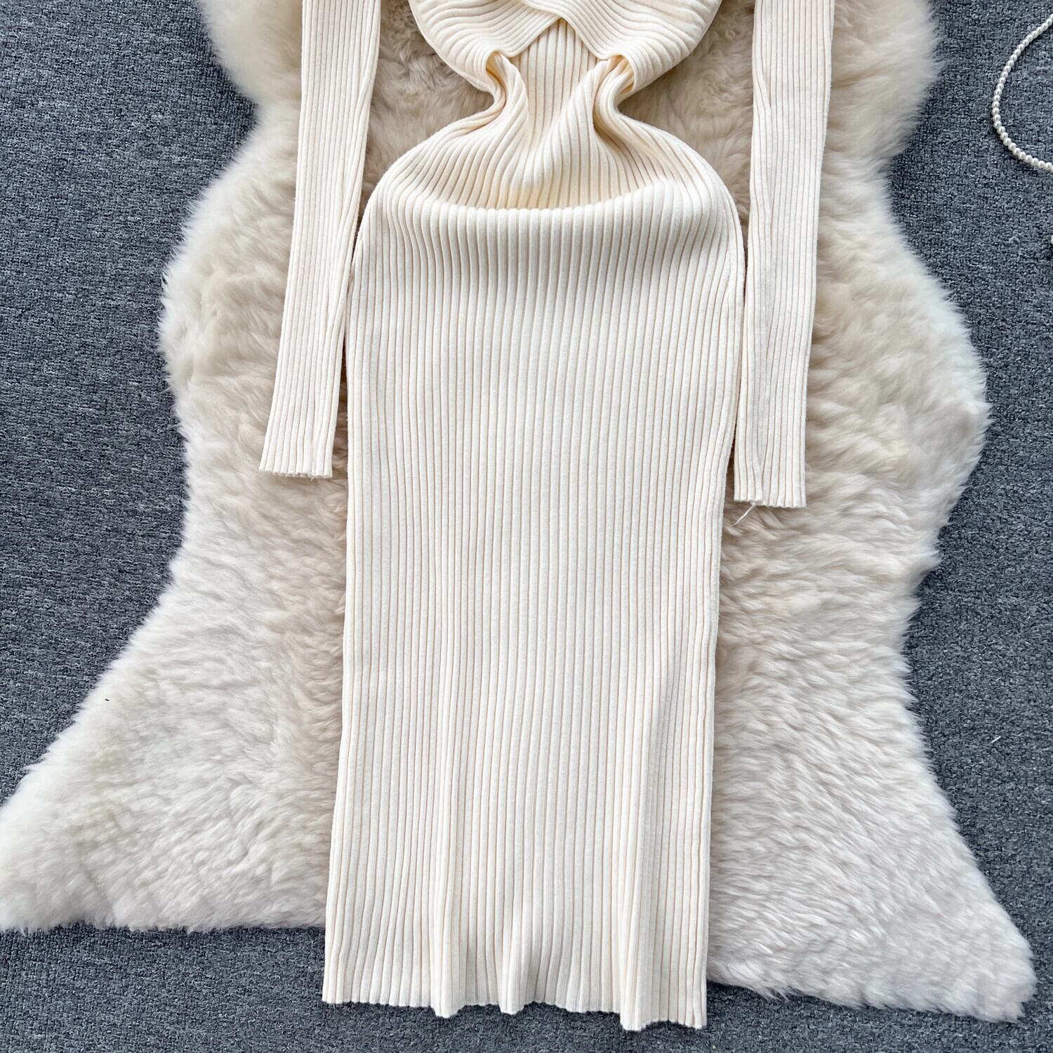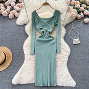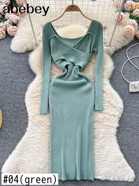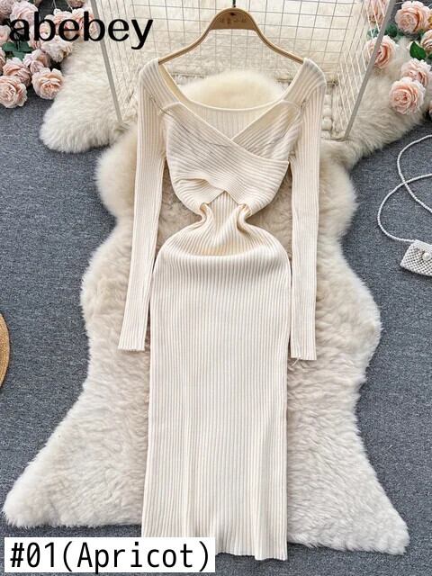 チェーンホルターニットドレスディープ V ネック長袖 Corss スキニー秋セクシーセータードレス ロング オータム 秋物 Vネック ソリッドカラー