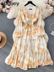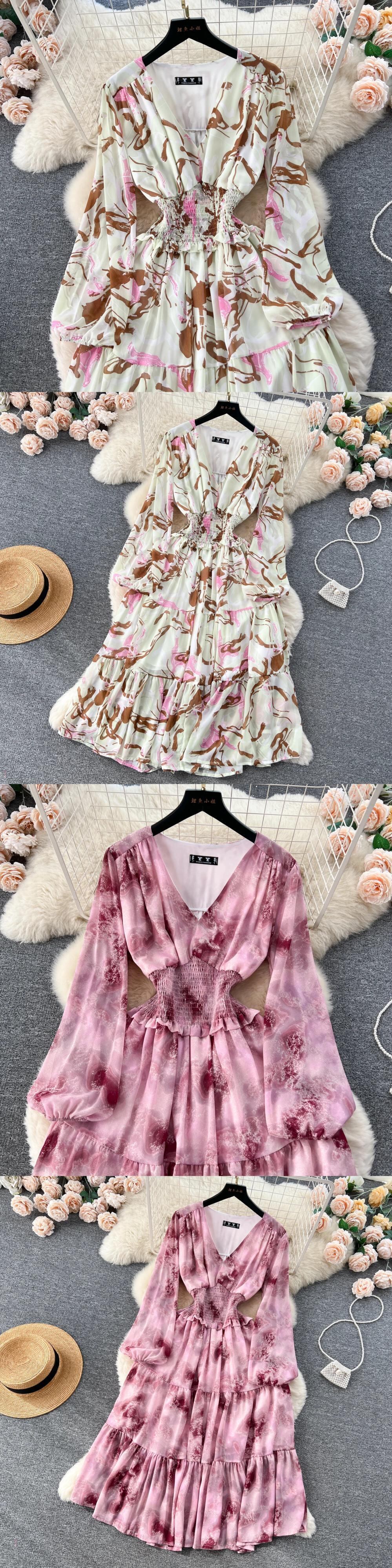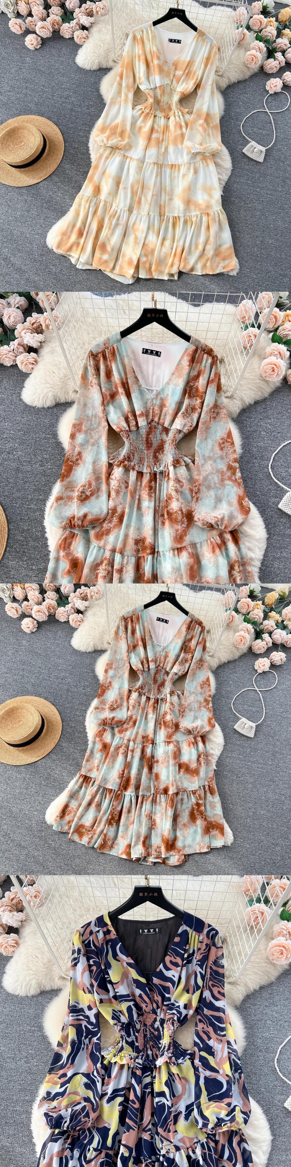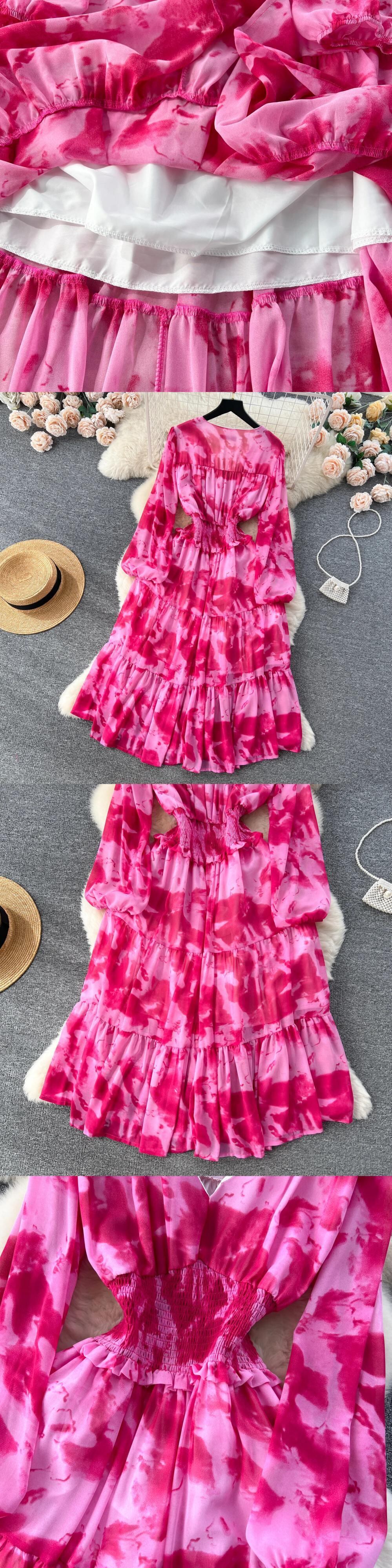 フレンチシック プリーツ ロングドレス Vネック パフスリーブ ウエストゴム シニア 秋 レディース パーティー Aラインドレス エラスティック 伸縮 オータム 秋物