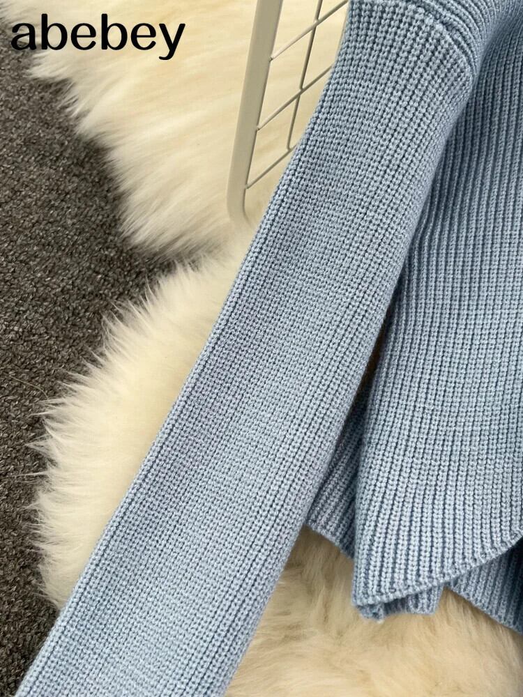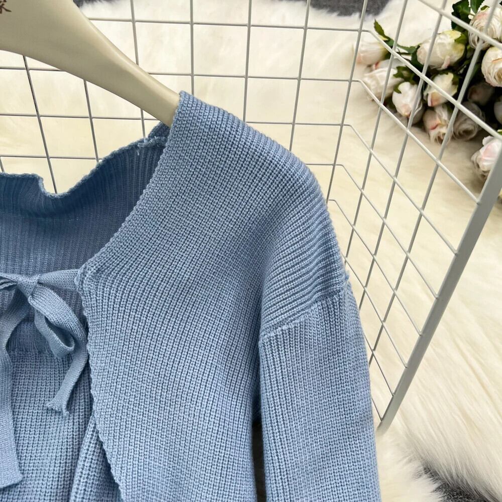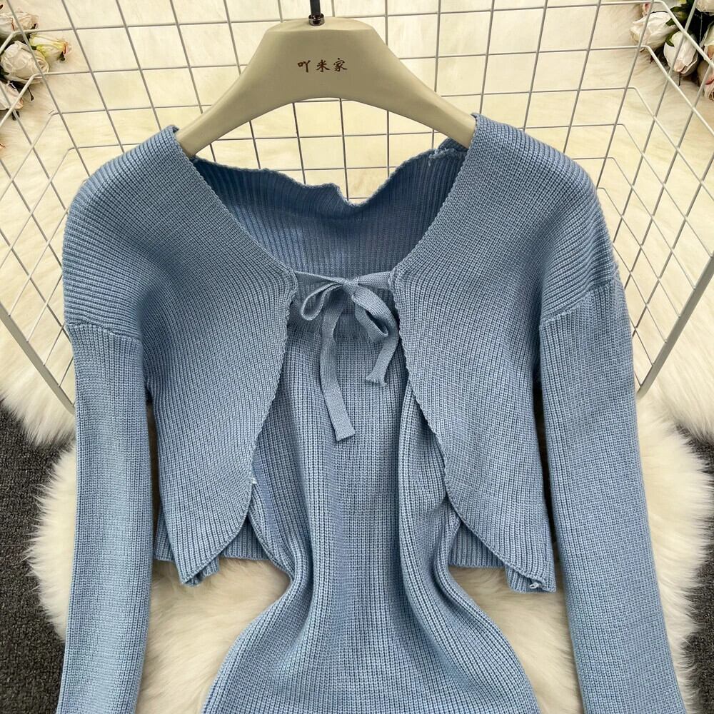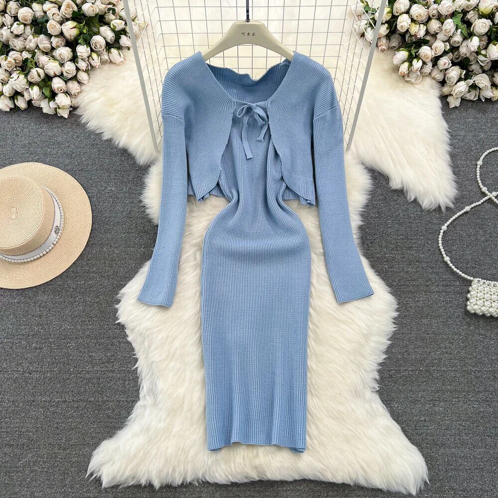 ニットセットルーズ長袖クロップトップセーター + 弾性ドレスフレンチスタイル 2 点セット ロング エラスティック 伸縮 ソリッドカラー