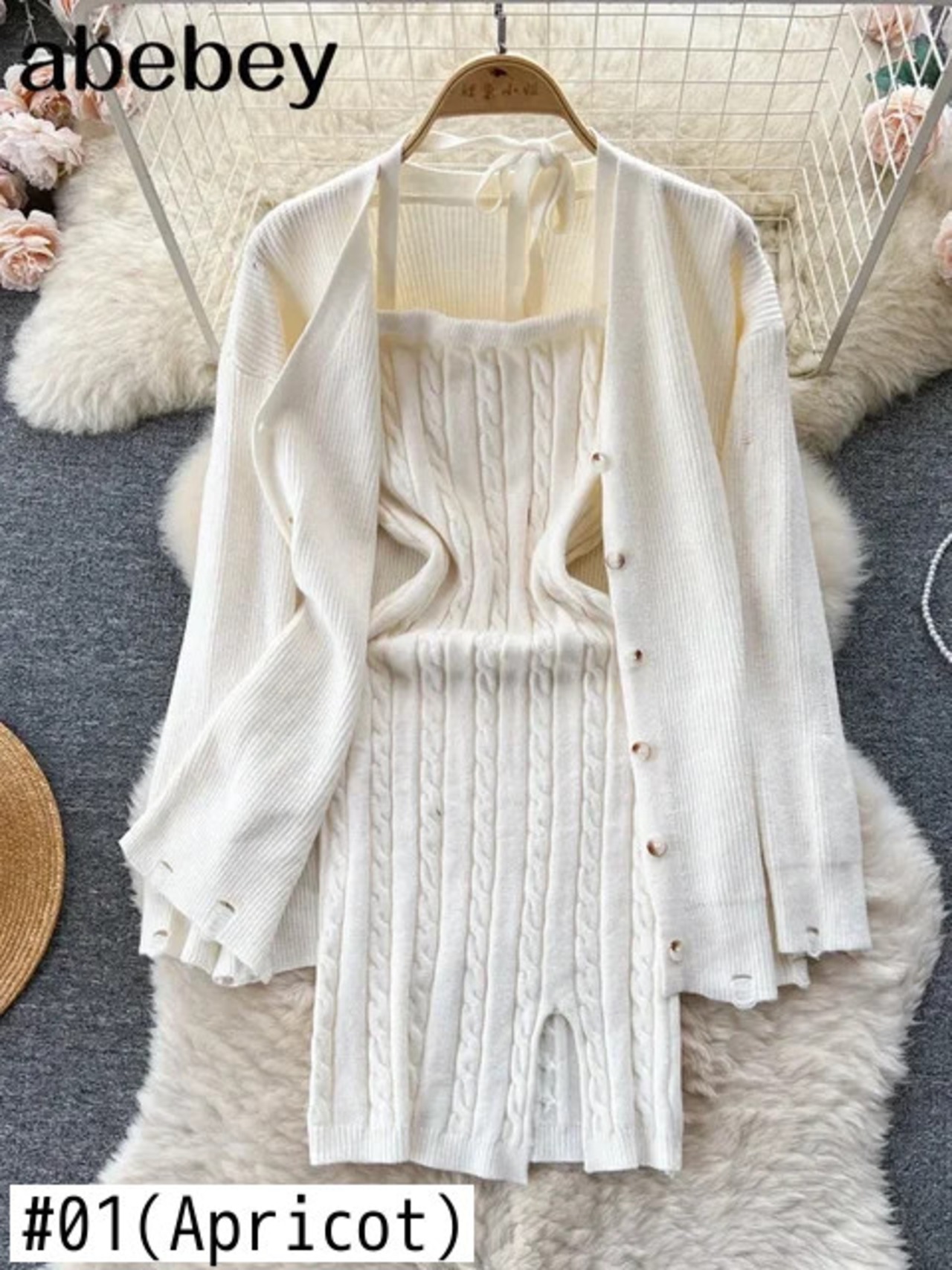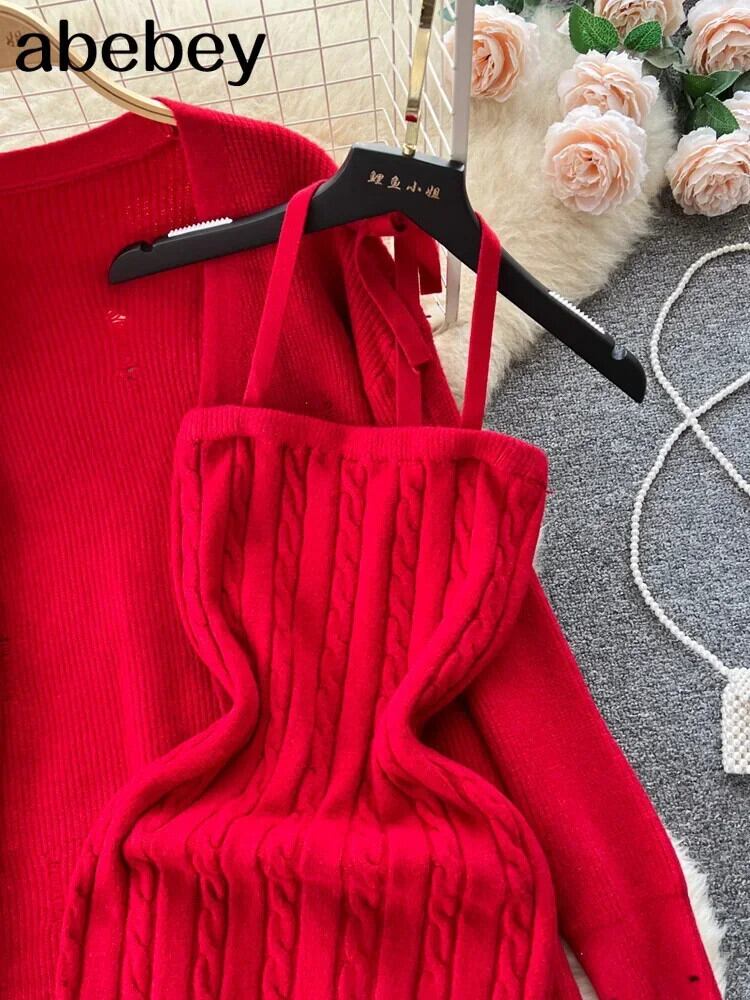 赤いスーツホルターストラップチェーンスリムボディコンドレス + スキニーショートカーディガン冬シック甘いセット レッド 大人ガーリー スウィート キュート カジュアル ウィンター 冬物