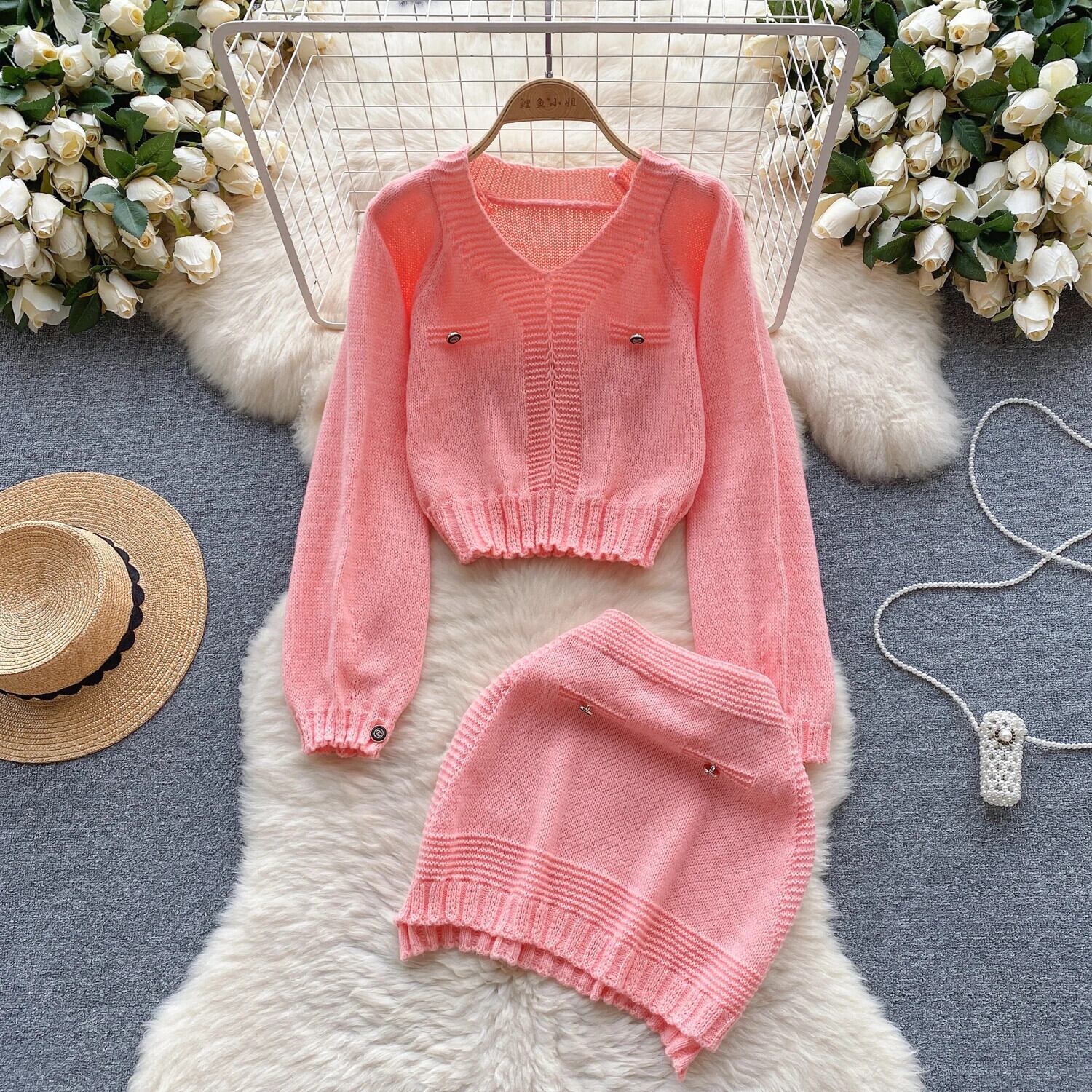 冬暖かいニットスーツ V ネックショートプルオーバー + ウエスト弾性ボディコンロングスカートスキニー厚いセット エラスティック 伸縮 ウィンター 冬物 ソリッドカラー