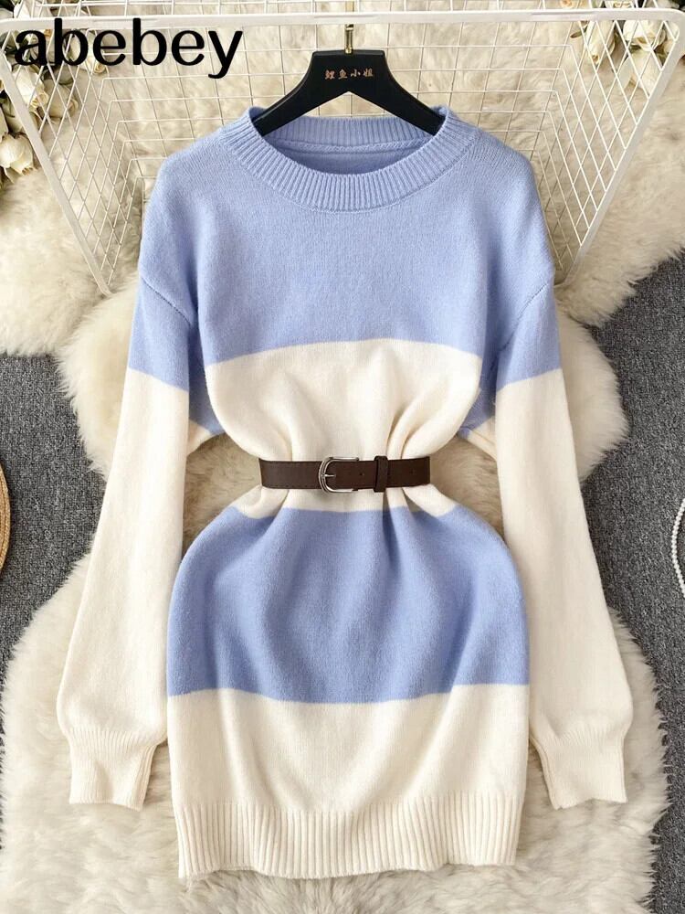 ストライプセータードレスOネック長袖ベルトポケット冬スタイルAラインミディドレス ロング ウィンター 冬物 ハーネス