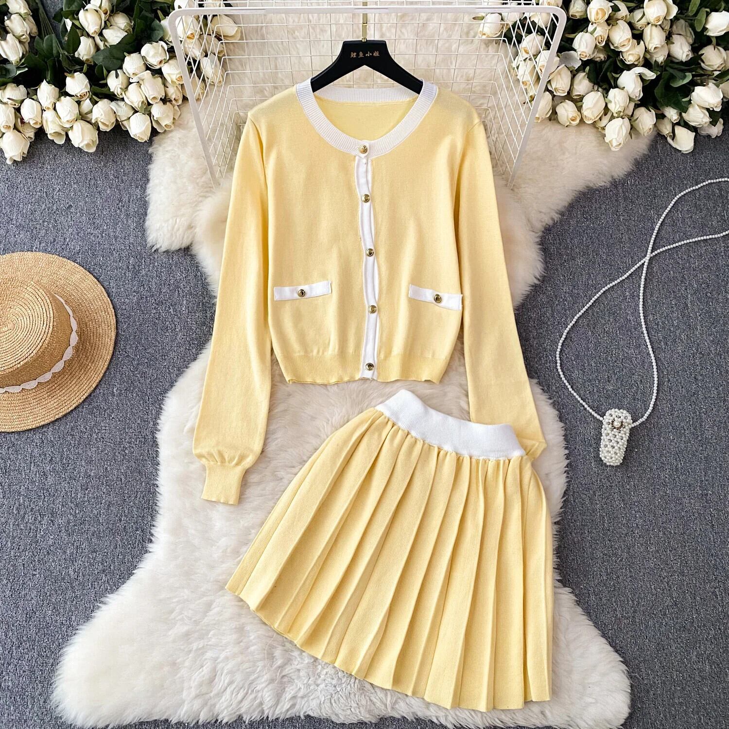 甘いニットスーツ O ネックシングルブレストルーズカーディガン + ミニプリーツスカート秋スタイルシックセット 大人ガーリー スウィート キュート カジュアル オータム 秋物 Oネック