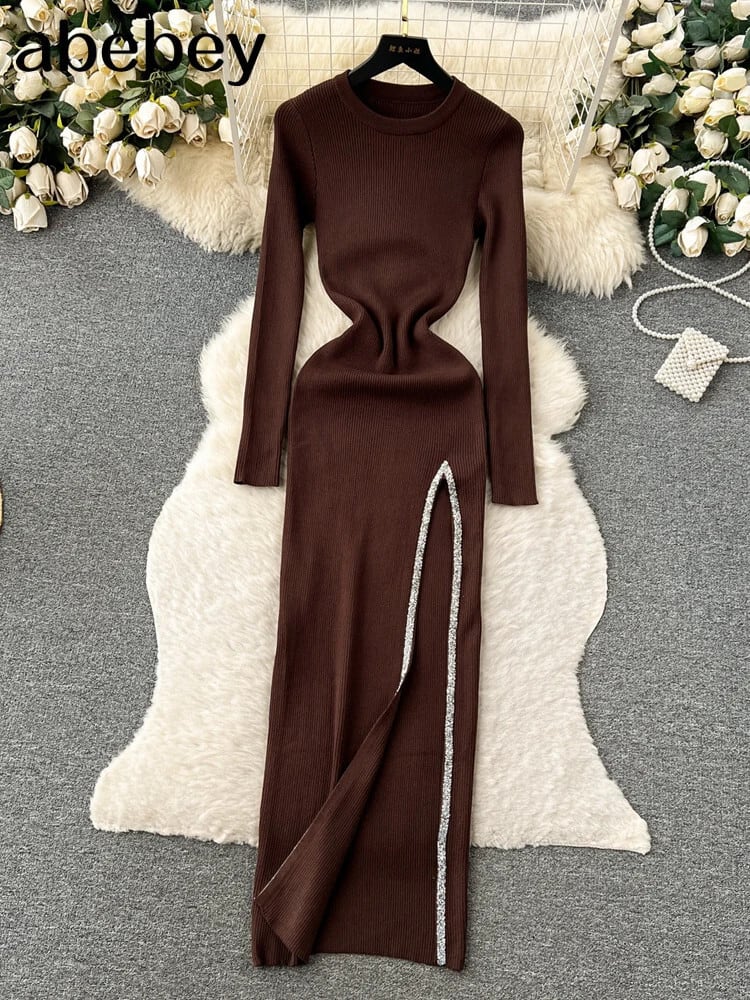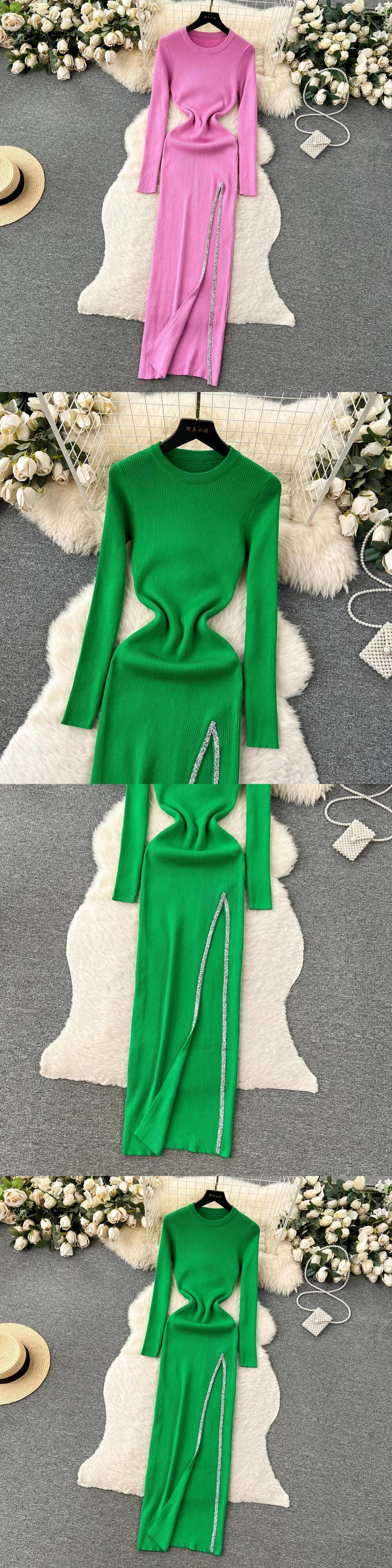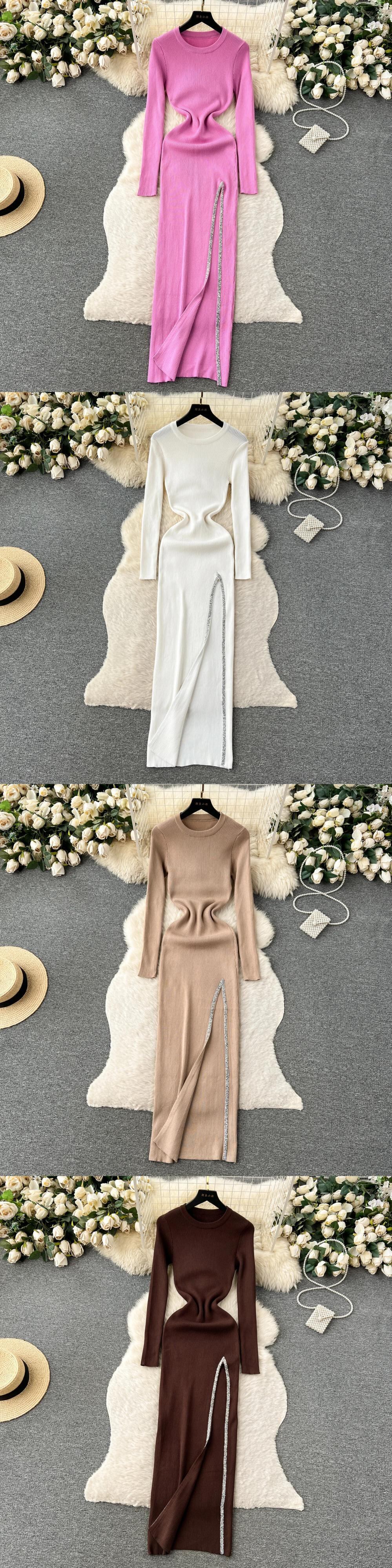 ストリートニットスプリットドレス O ネック長袖スリムフィットフランスエレガント秋イブニングパーティーボディコンロングドレス オータム 秋物 Oネック