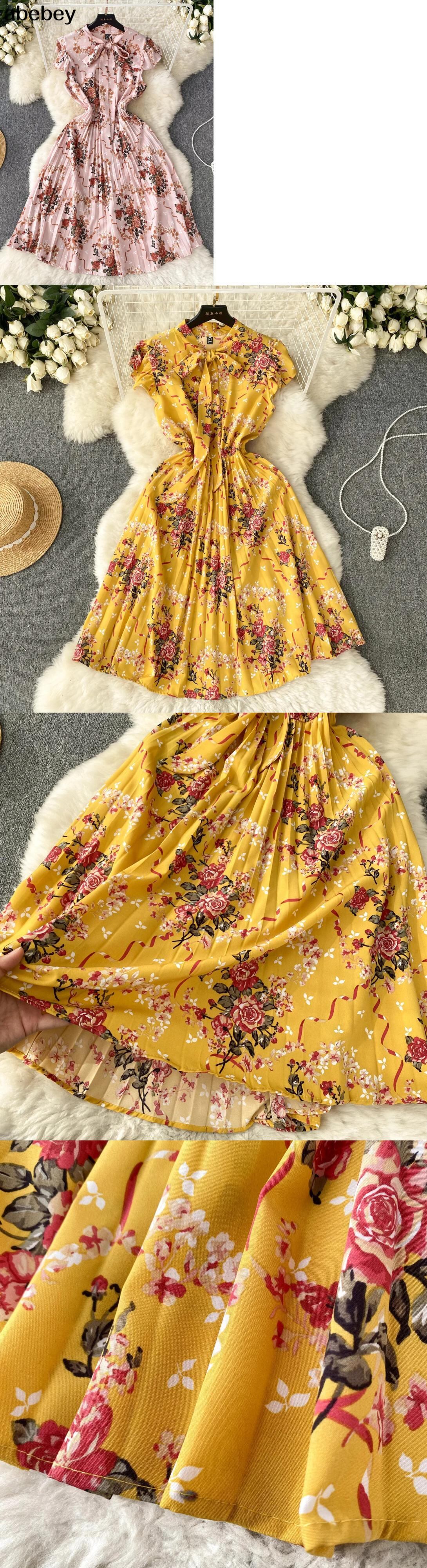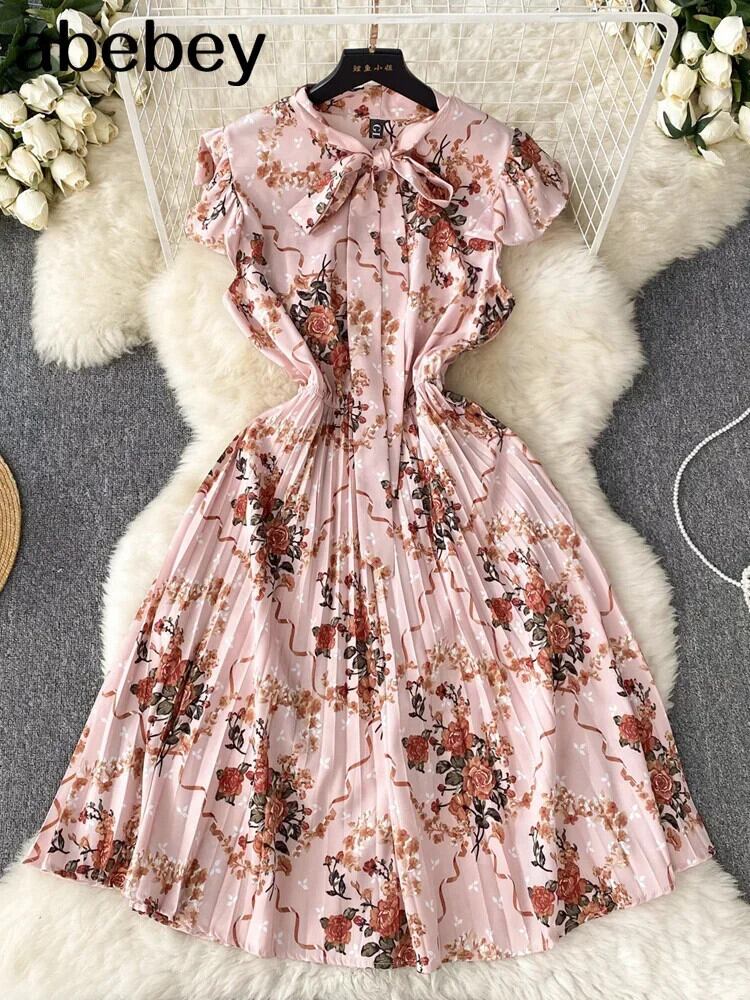 フランスレトロシフォンサンドレスレースアップ弓襟半袖花柄ホリデー MIDI ドレス ショート リボン ハーフスリーブ