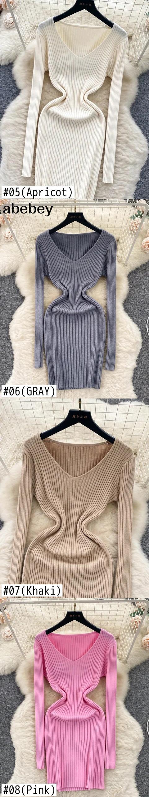 秋ニットミディドレス v ネック長袖ストリートシンプルスタイルベーシックスリムフィットセーターボディコンドレス ロング オータム 秋物 Vネック ソリッドカラー