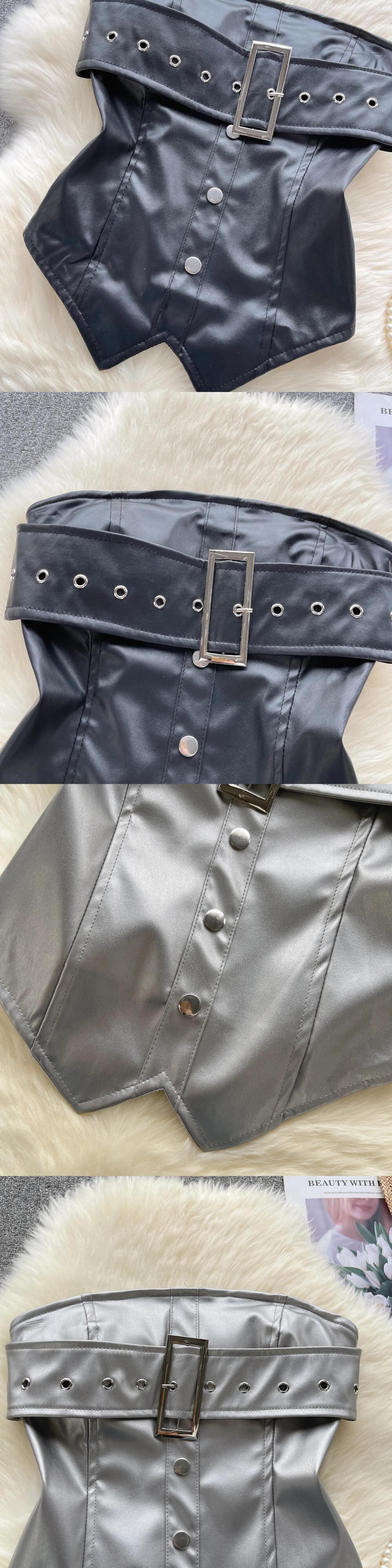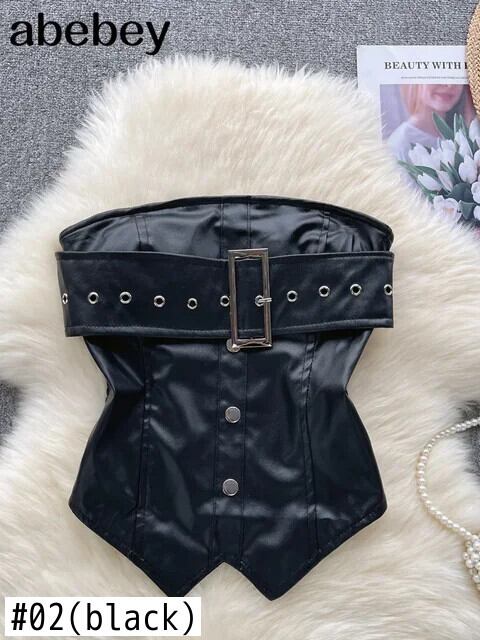 ストラップレス レースアップ スリム キャミソール ジッパー ストリート ソリッド PU レザー セクシー タンク トップ ソリッドカラー