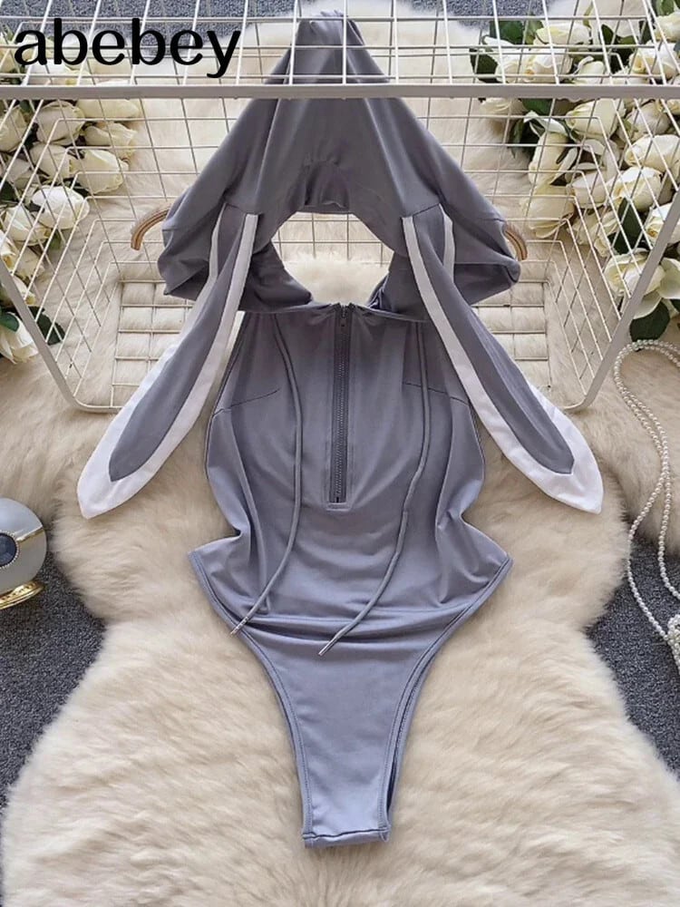 コスプレウサギ女子エロロンパース官能的背中開いたジッパーフード付きロンパースアウトセクシーボディスーツ