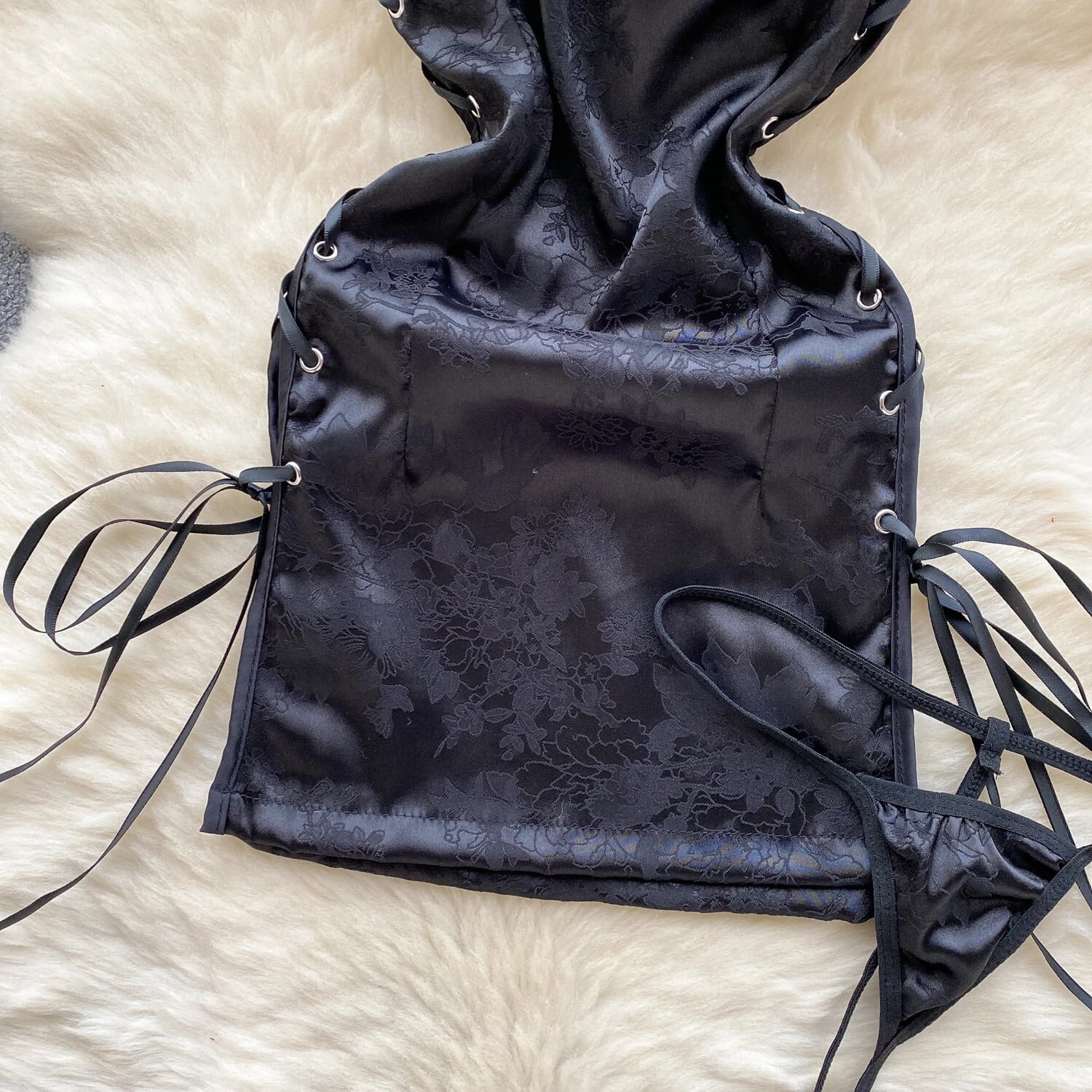 レースアップ花柄メッシュセクシー寝間着ホルターアウトスリムショートドレス背中開いたサテン薄手エロナイト