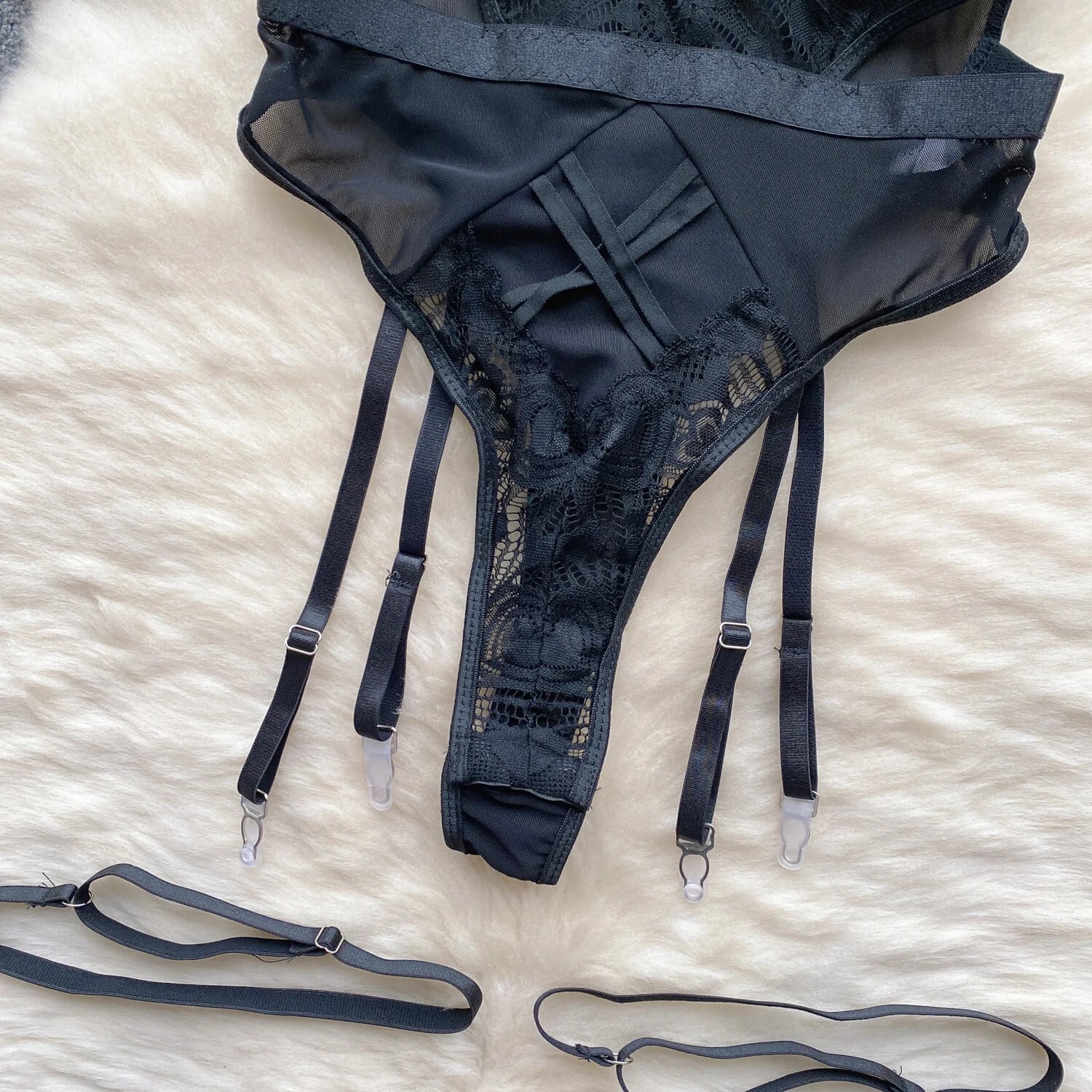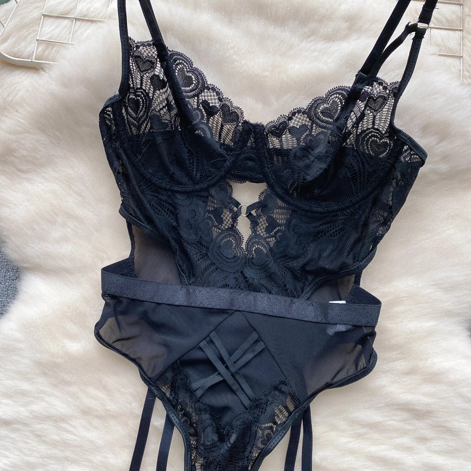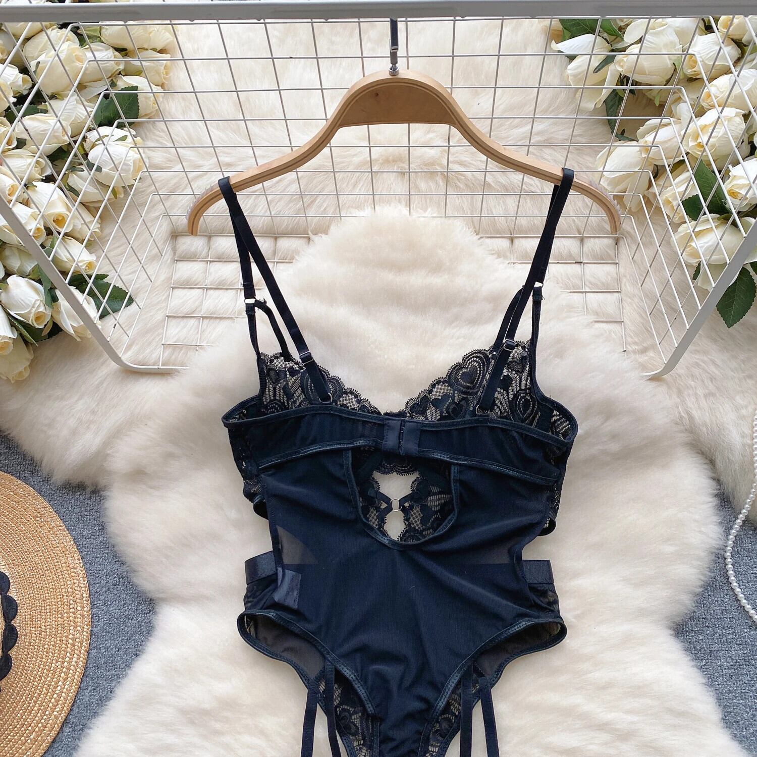 セクシー透明メッシュストラップボディスーツエロ背中開いたキャットスーツワンピース花レースコンビネーションロンパース 花柄