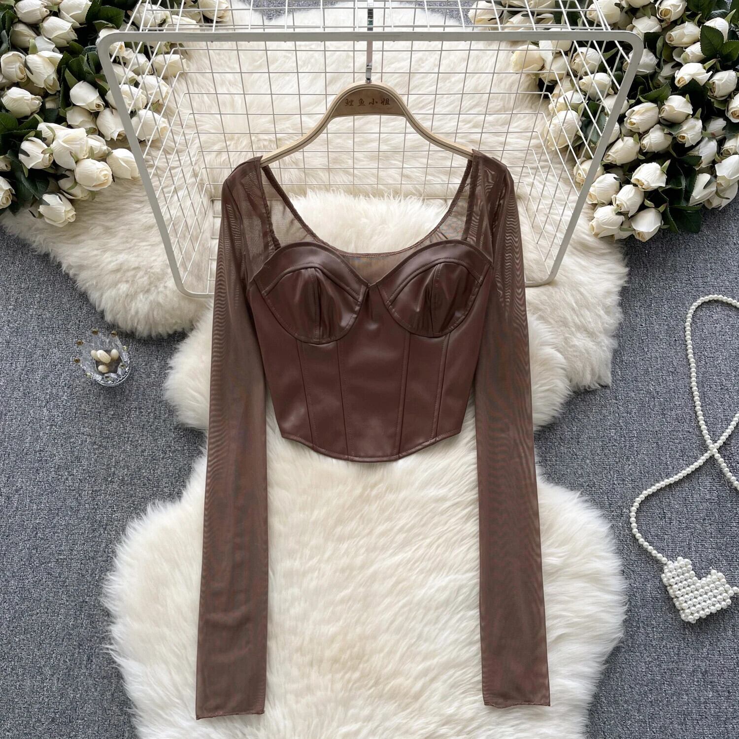 セクシー弾性メッシュ薄手パッチワーク Tシャツ長袖シック Tシャツクロップトップスリム Tシャツ春夏ストリート ロング エラスティック 伸縮 スプリング 春物 サマー 夏物 ソリッドカラー
