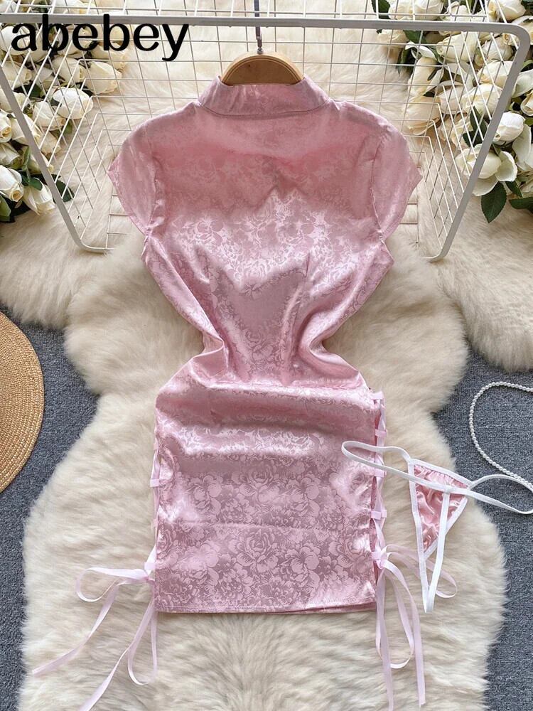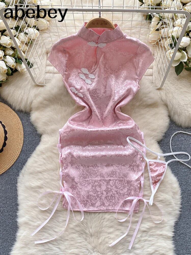Chi-pao スプリットセクシーショートドレスボタンスリムプリントポルノナイト + Tバック中国レトロ官能的寝間着