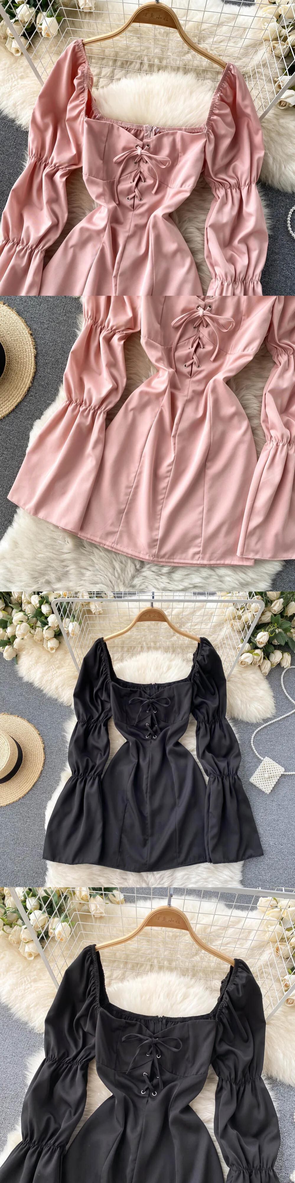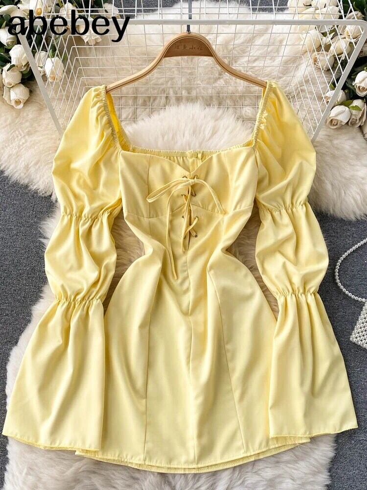 セクシードレススクエアネックパフスリーブストリートレースアップクロス包帯気質Aラインミニドレス スクウェア