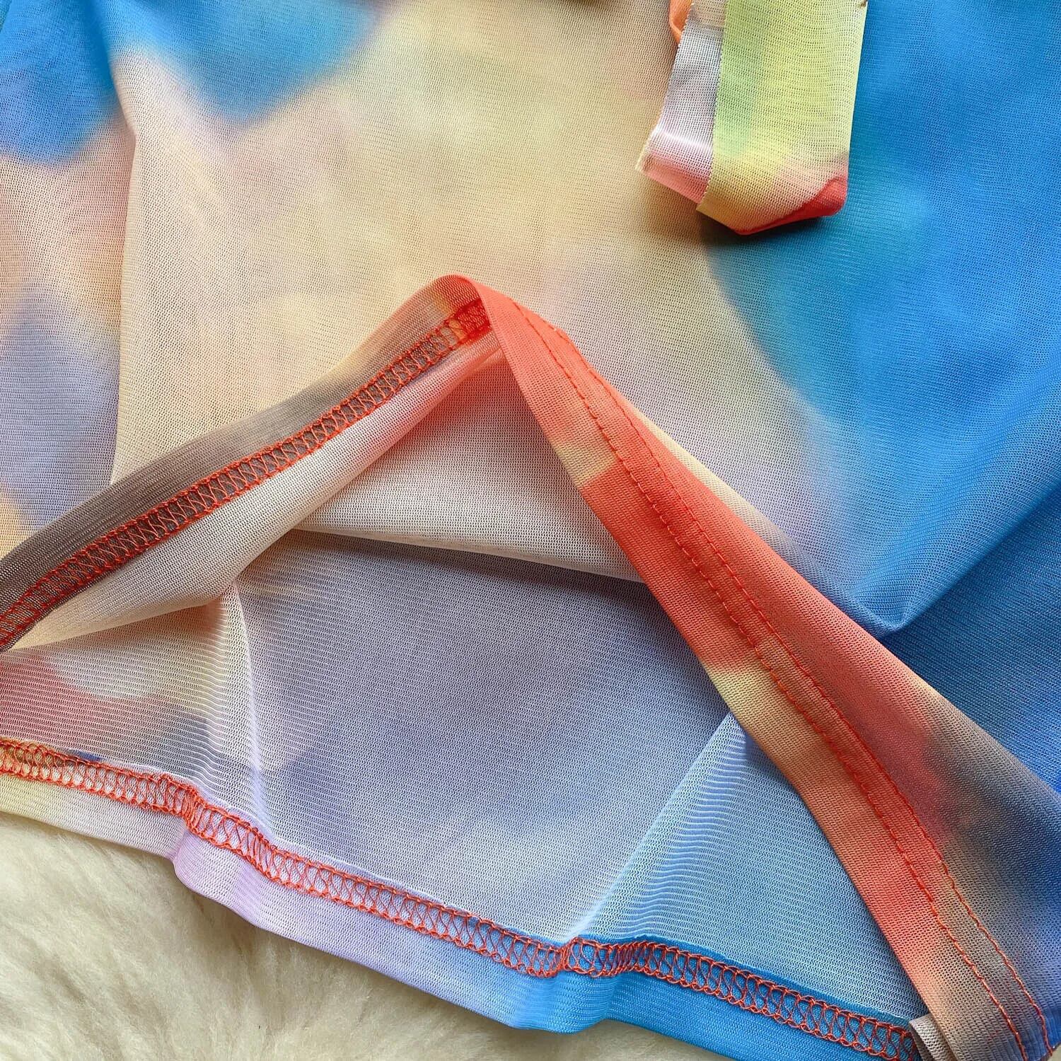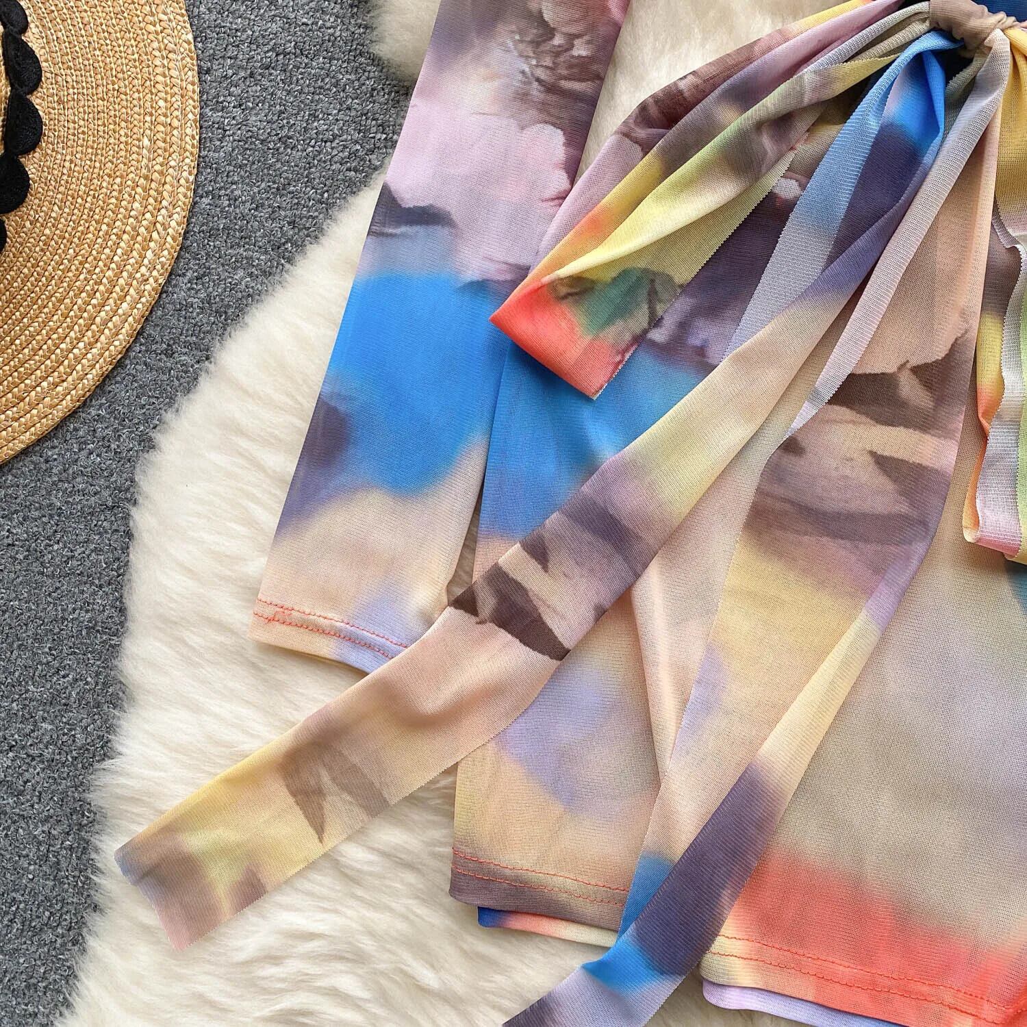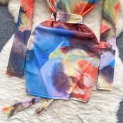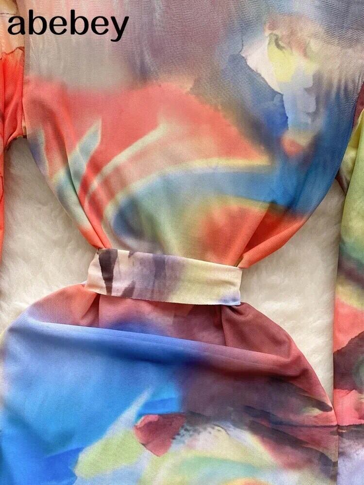 芸術的タイダイメッシュセクシードレスタートルネック長袖サッシュ弾性スリムシアープリントミニドレス ロング エラスティック 伸縮