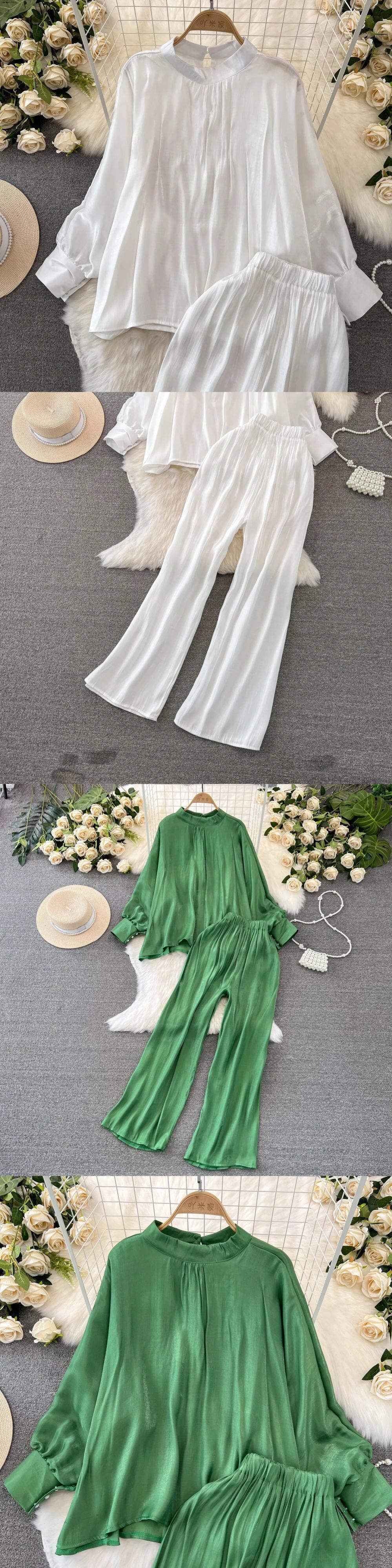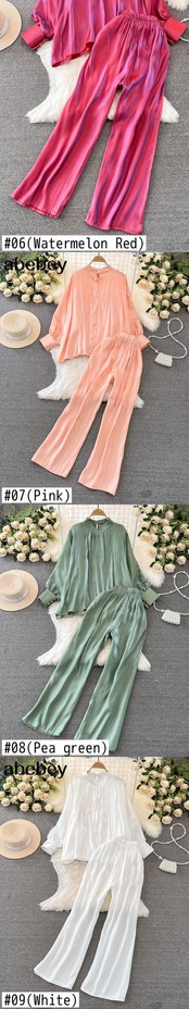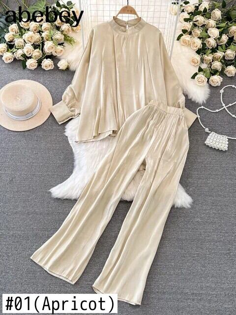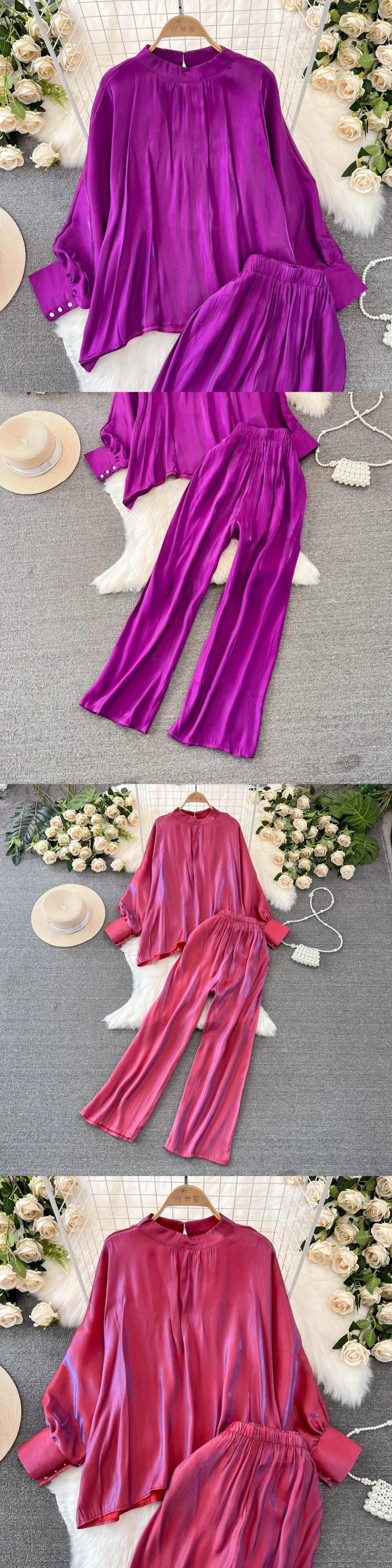 レディースセット シャイニングレディースシャツ Vネック ロングフレアスリーブ クロップトップス ソリッドカラー レディーストップス + パンツ ワイドレッグパンツ レッド ワイドパンツ