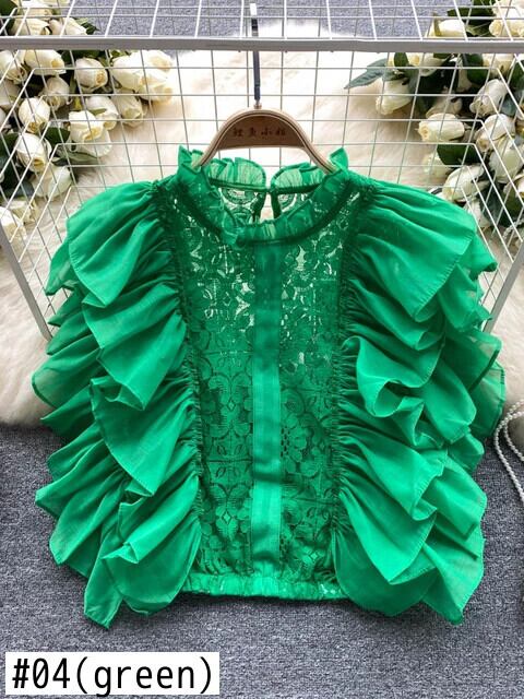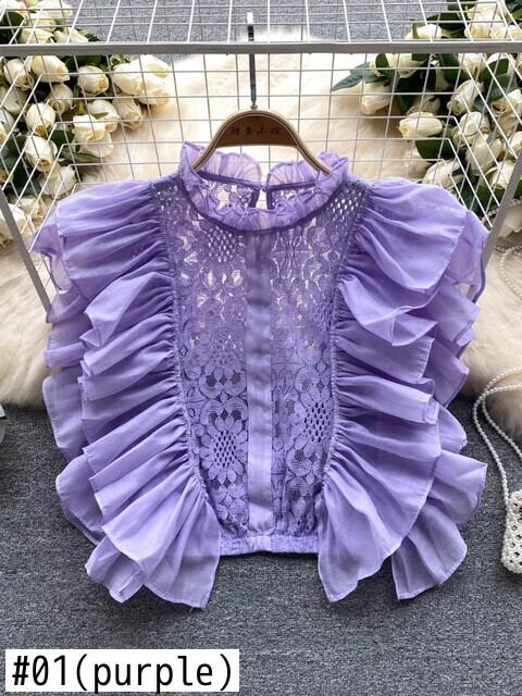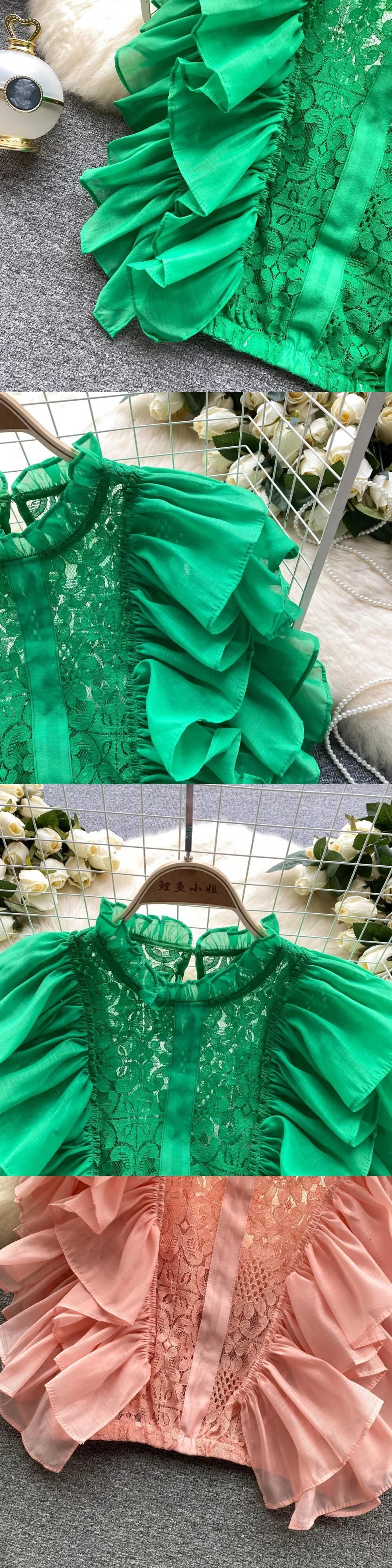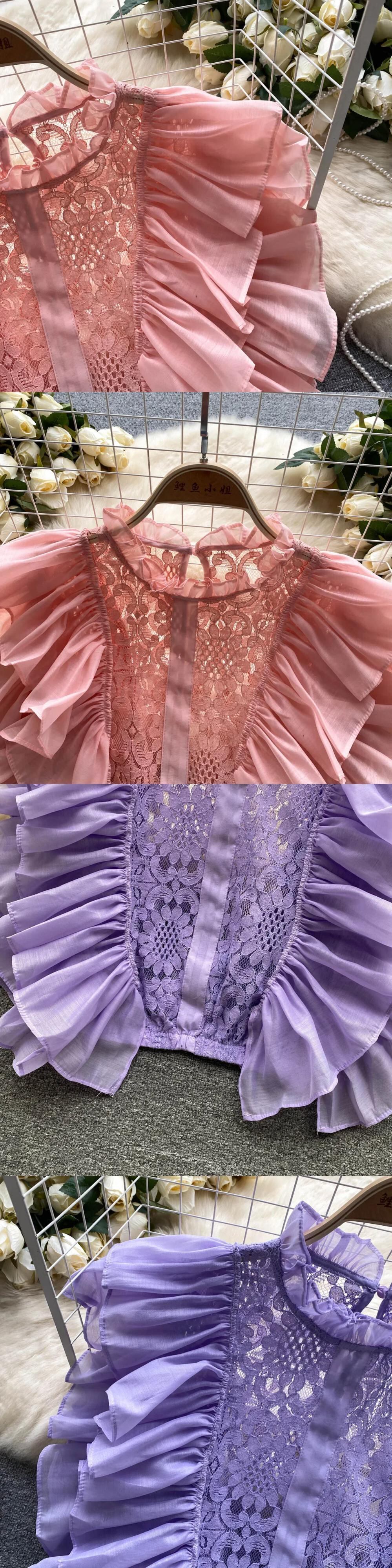 レースパッチワークショートトップフリルノースリーブ O ネックアウト Y2K コートセクシータンクトップ ラッフル Oネック