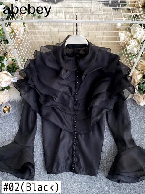 シャツ 2024 春秋フランス宮殿スタイルスーパー妖精レイヤードフリルオーガンザフレアスリーブブラウス レッド レース スプリング 春物 オータム 秋物
