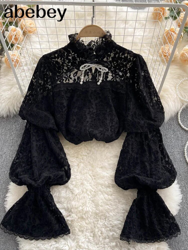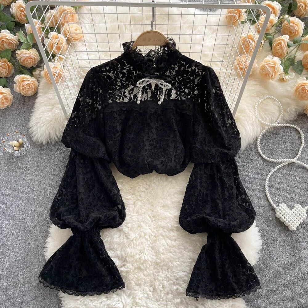 刺繍ブラウススタンドカラー長袖花ルーズシャツ ロング 花柄