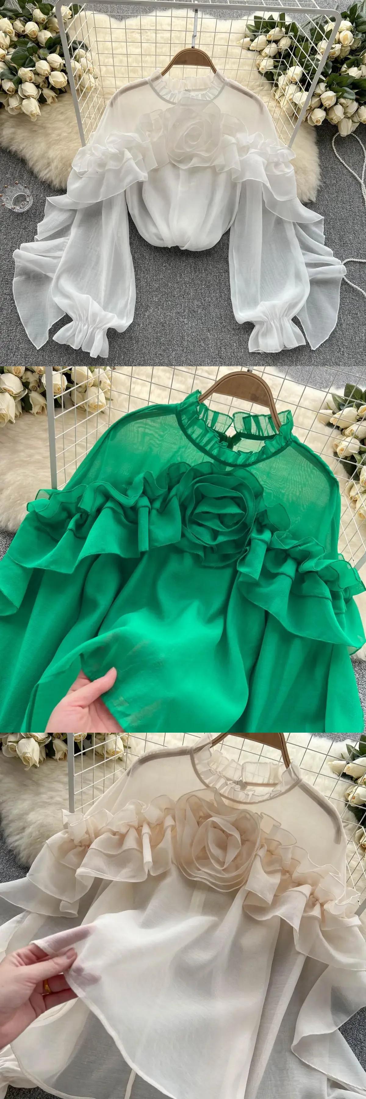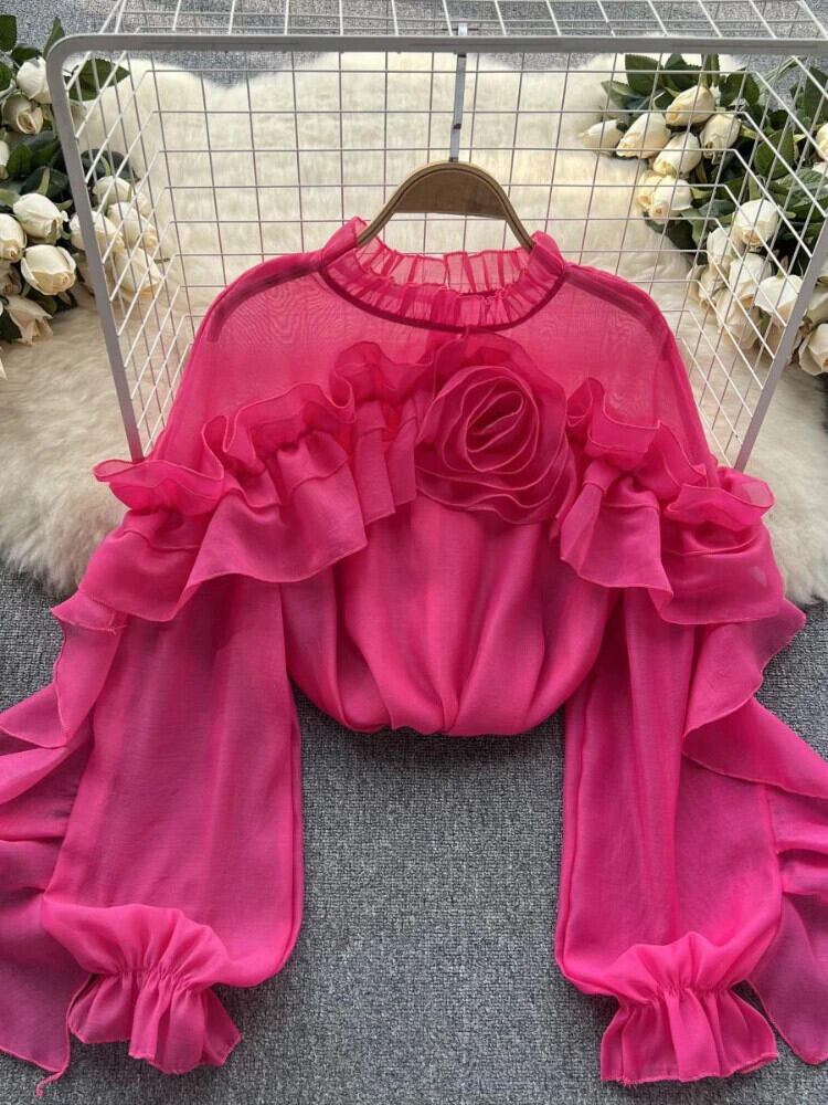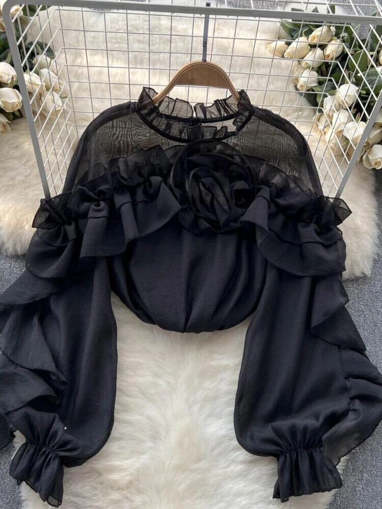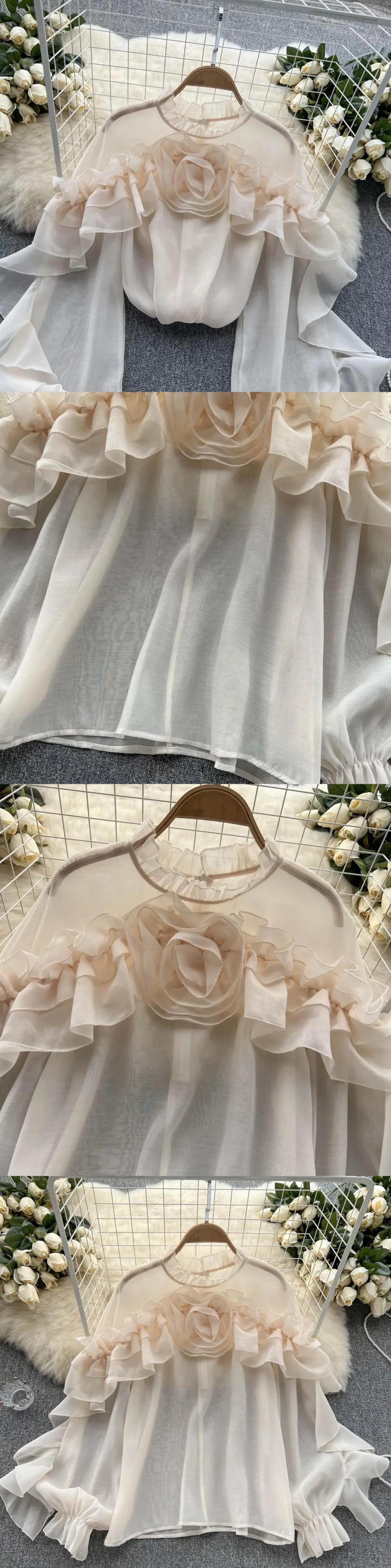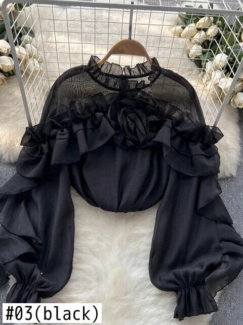 フリルシフォンブラウス夏ランタンスリーブスリムルーズ休暇 Y2K シックトップス サマー 夏物