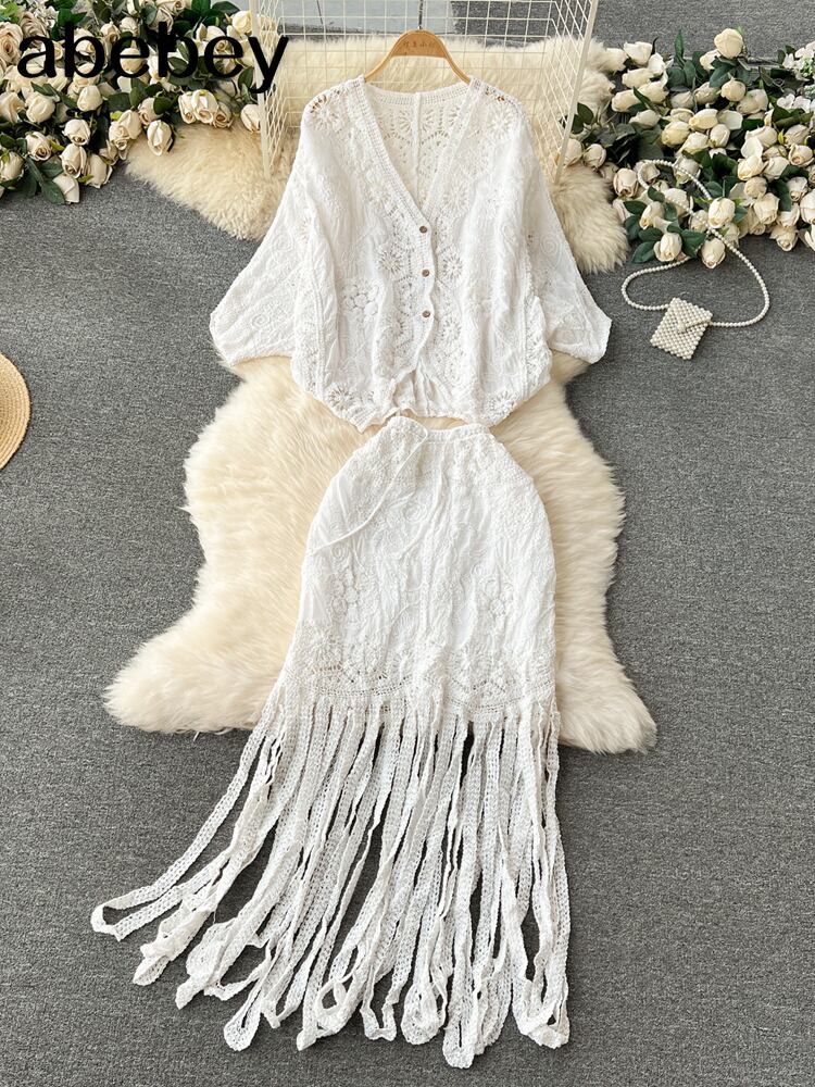 ボヘミアンスタイルルーズスーツフックフラワーアウトバットスリーブシャツ + テル巾着ボディコンスカート春セット スプリング 春物 フラワーデザイン