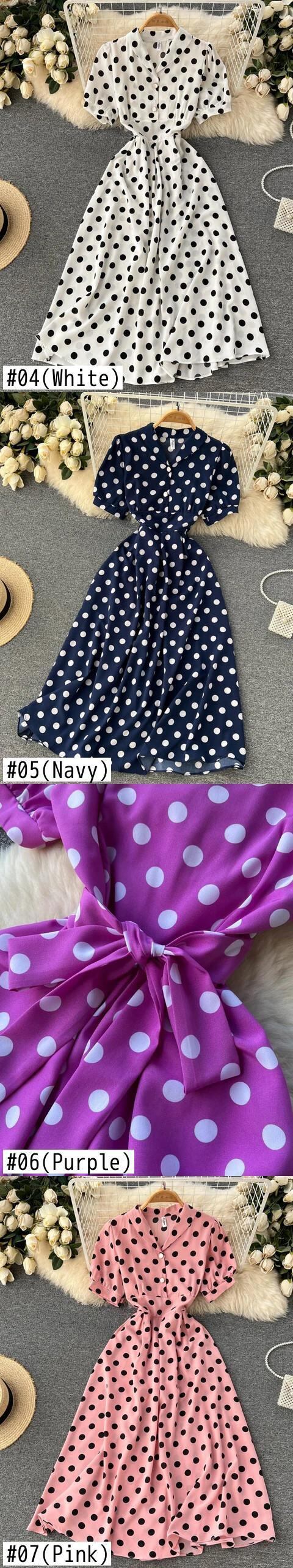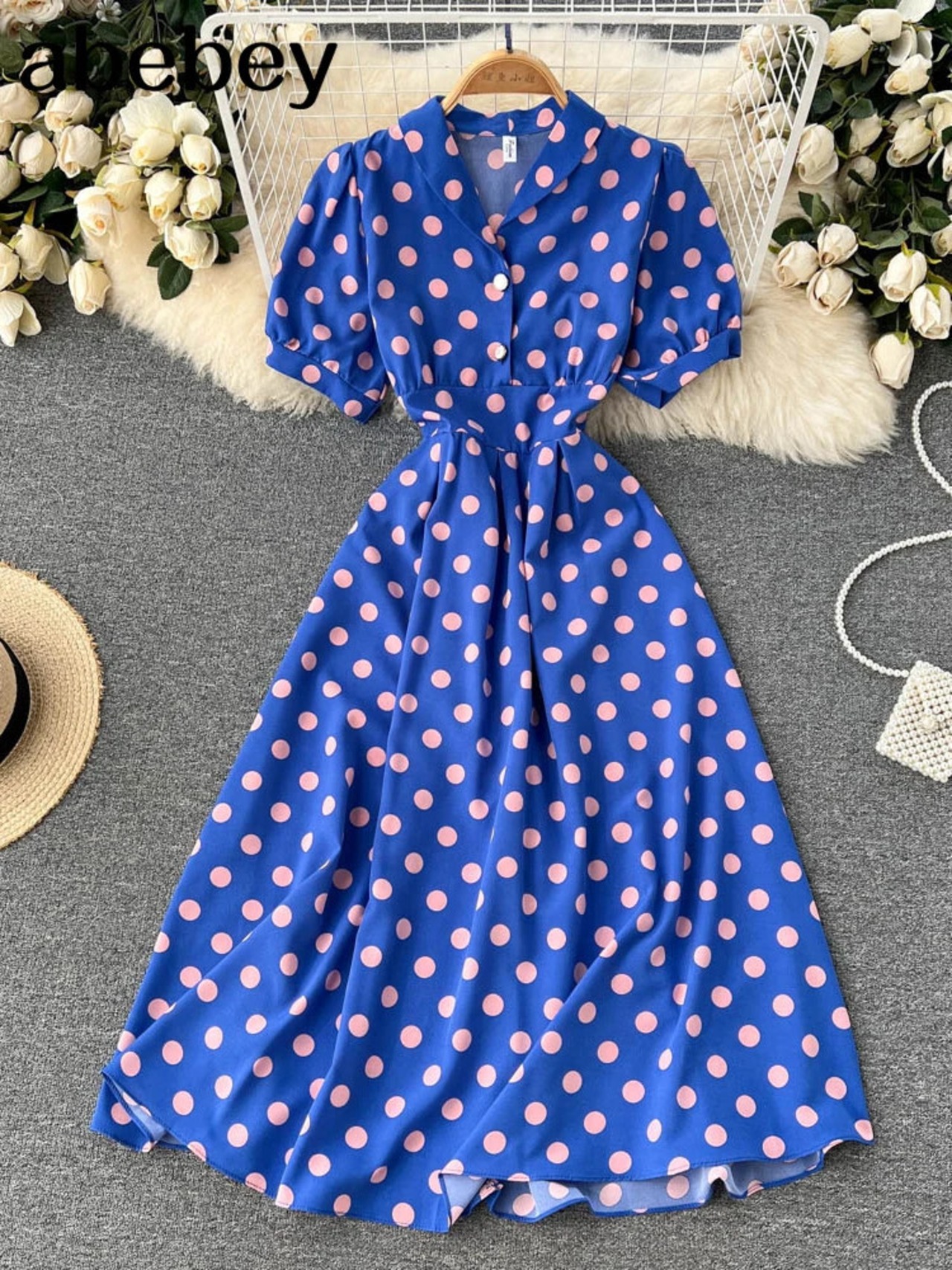 Frenchic ウエストサマードレス水玉パフスリーブ V ネック A ラインドレス Vestidos 夏物 Vネック Aライン