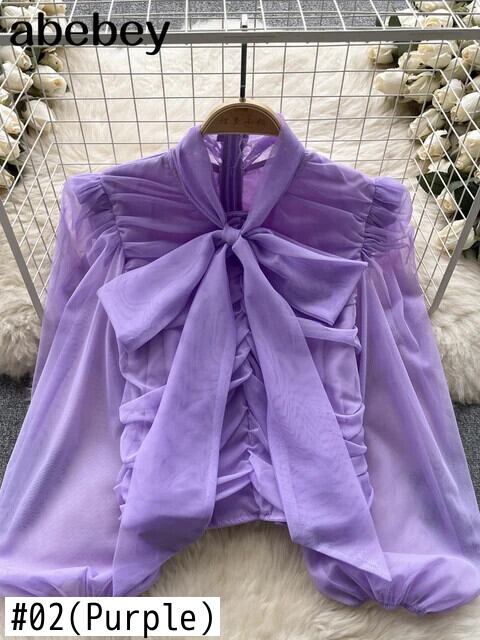 フレンチコート シアー ブラウス ボウカラー ランタン スリーブ トップス ストリート 折り目 ジッパー OL メッシュ シャツ ランタンスリーブ リボン