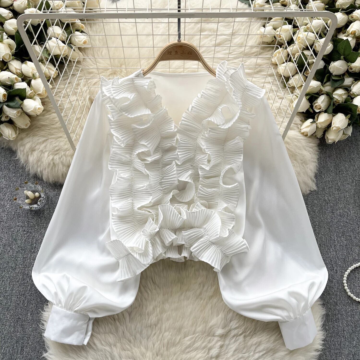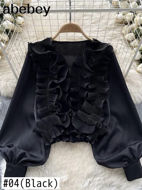 フレンチルーズブラウスランタンスリーブトップス2024 Vネック食用木菌春シャツ スプリング 春物
