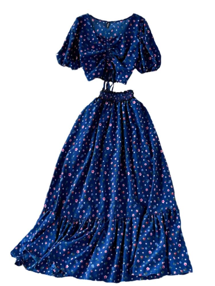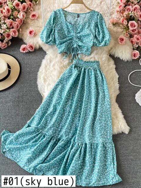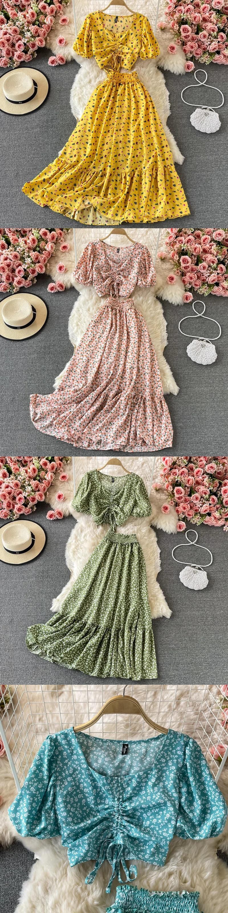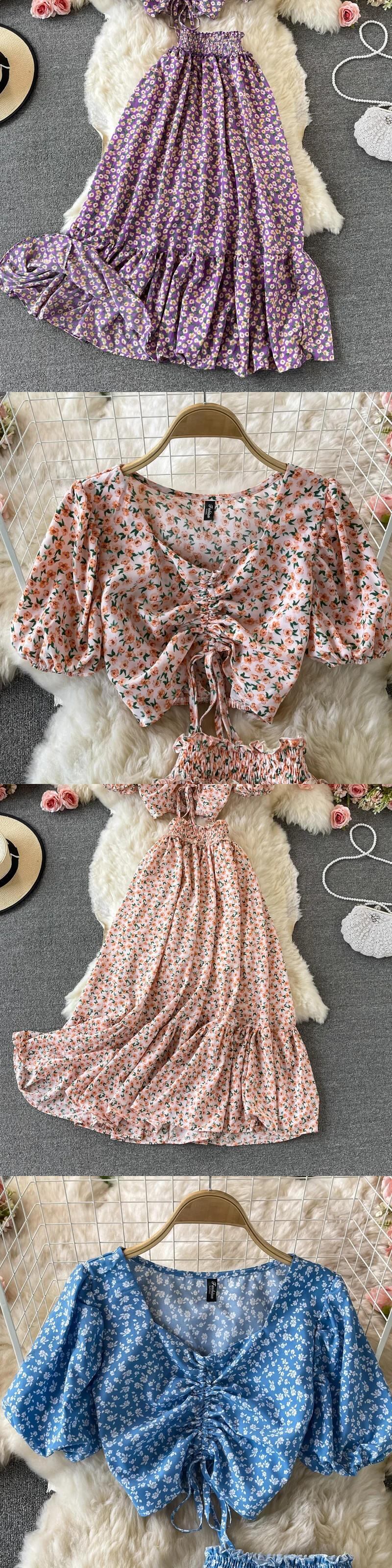 夏ボヘミアンシフォン花柄セットパフスリーブ V ネックショートトップス + ウエスト A ラインマキシスカートツーピーススーツ サマー 夏物 Vネック Aライン