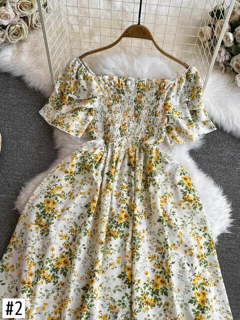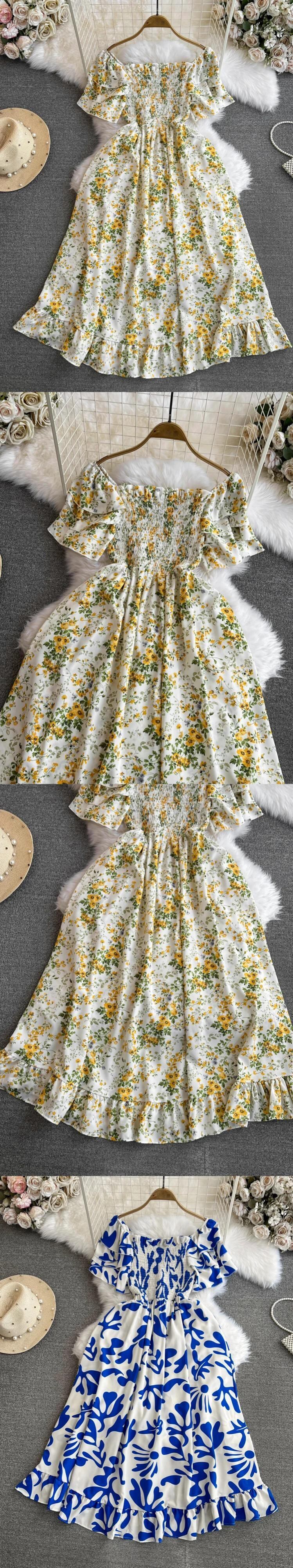 サマードレス スラッシュネック オフショルダー プリント Aライン ホリデー ビーチ Vestidos フレンチシック ウエストドレス 夏物