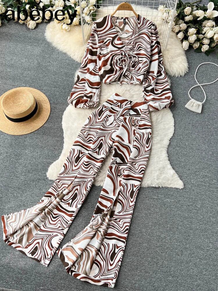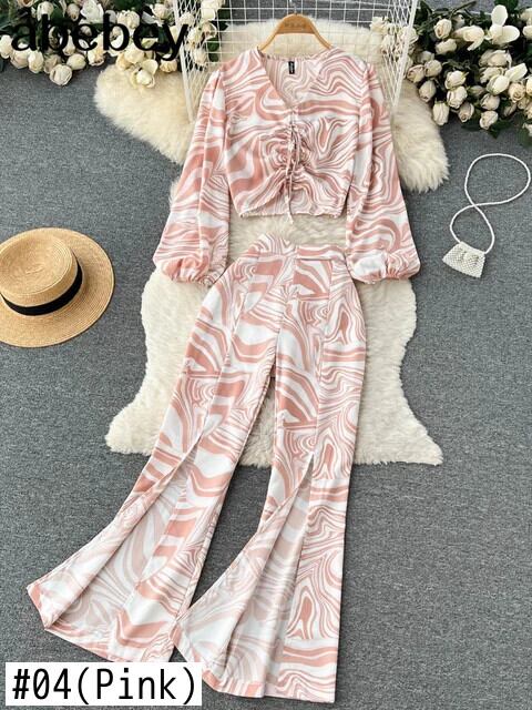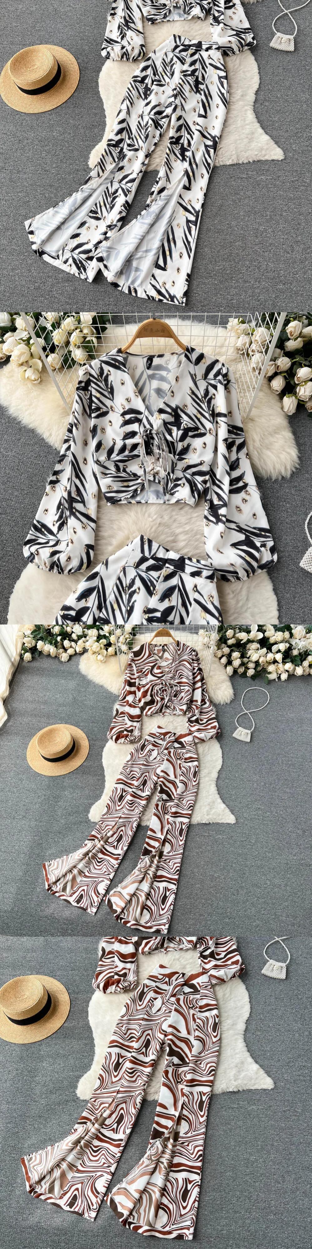 夏花柄プリント 2 点セットセクシー V ネックランタンスリーブショートトップス + ワイドレッグパンツスーツ休暇ビーチ サマー 夏物 Vネック ワイドパンツ