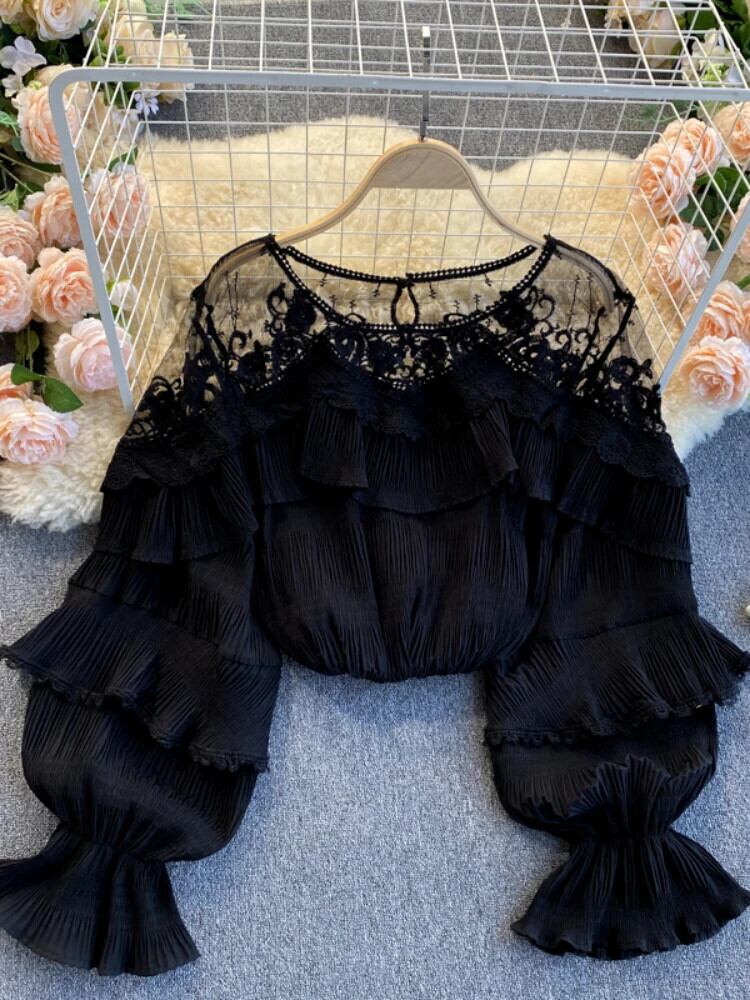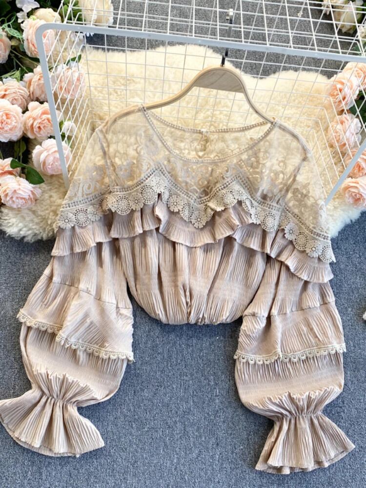 フレンチメッシュスプライスブラウスパフスリーブレースフリルブラウス秋ルーズストリートトップス ラッフル オータム 秋物 ソリッドカラー